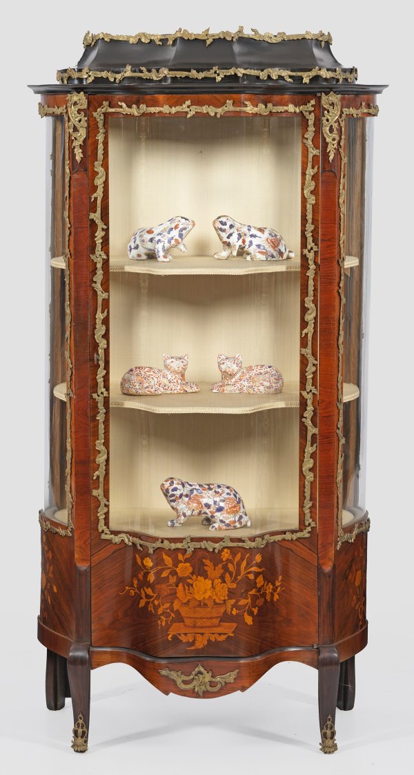 Palisander furniert und teilw. ebonisiert sowie Einlagen aus unterschiedlichen Hölzern. Dreiseitig stark bombierter Korpus auf leicht geschweiften Beinen. In der gegliederten Front Vitrinentür mit intarsiertem Blütenarrangement. Geschweift ansteigender oberer Abschluss sowie Applikationen aus Bronze. H. 166 cm. 87 cm x 42 cm.