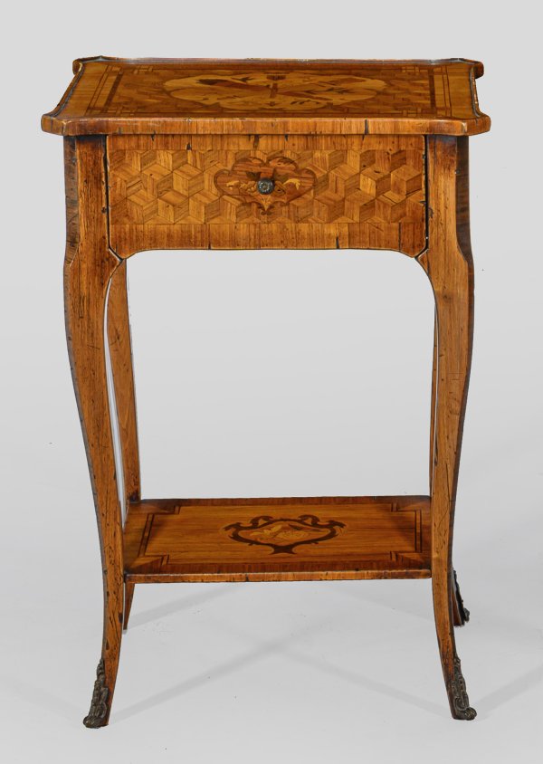 Nussbaum und Rosenholz, furniert sowie Einlagen aus unterschiedlichen Hölzern. Gerader, einschübiger Zargenkasten auf geschweiften Beinen, unterhalb durch eingezogenes Ablagefach verbunden. Gering überstehende Deckplatte mit flacher Galerierahmung sowie intarsierten Köchermotiven. Allseitig breit gerahmte Furnierfelder aus Würfelmarketerie und Blütenkartuschen. H. 69 cm. H. 46 cm x 36 cm.