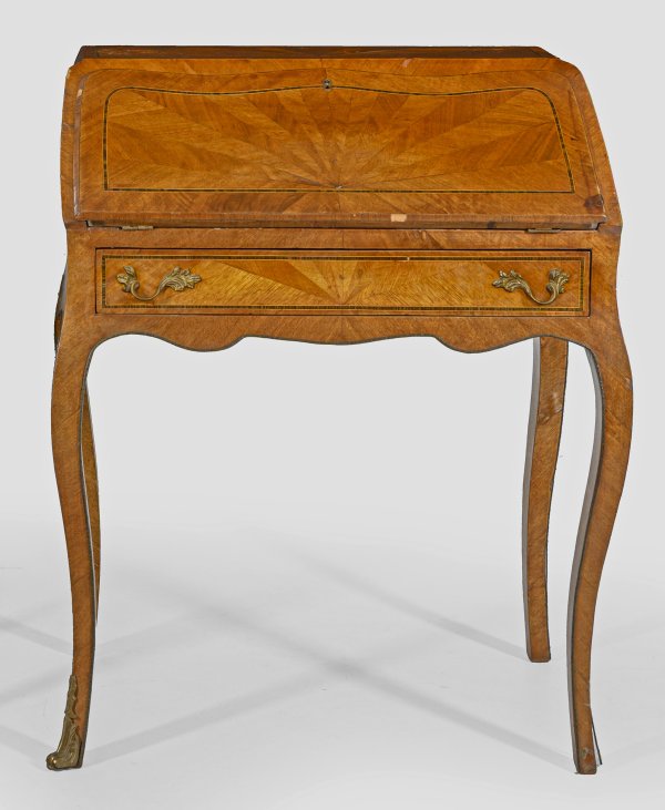 Nussbaum, furniert. Bombierter Korpus auf hohen, geschwungenen Beinen. In der Front flaches Schubfach sowie schräggestellte Arbeitsfläche. Allseitig Furnierfelder, schauseitig mit Bandeinlagen. H. 90 cm. 74 cm x 43 cm.