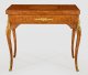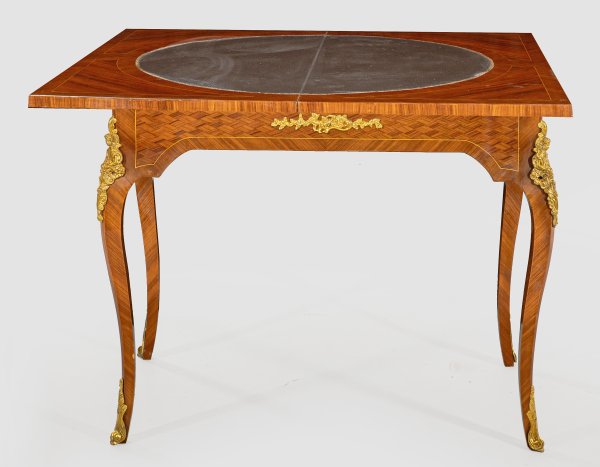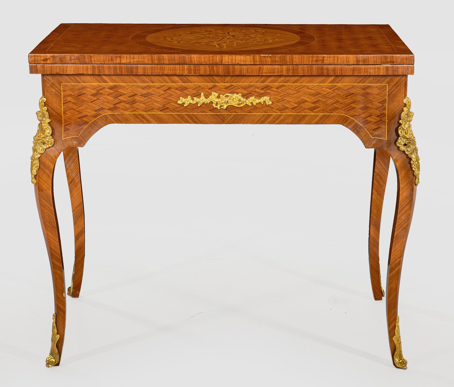 Nussbaum und Rosenholz, furniert. Gerader Zargenkasten auf geschwungenen Beinen. Gering überstehende, aufklapp- und drehbare Deckplatte mit eingelegtem Blütentondo, unterhalb mit Spielfläche. Allseitig breit gerahmte Furnierfelder aus Rautenmarketerie, von Fadeneinlagen begrenzt. Applikationen aus vergoldeter Bronze. H. 76 cm. 88 cm x 49/98 cm.