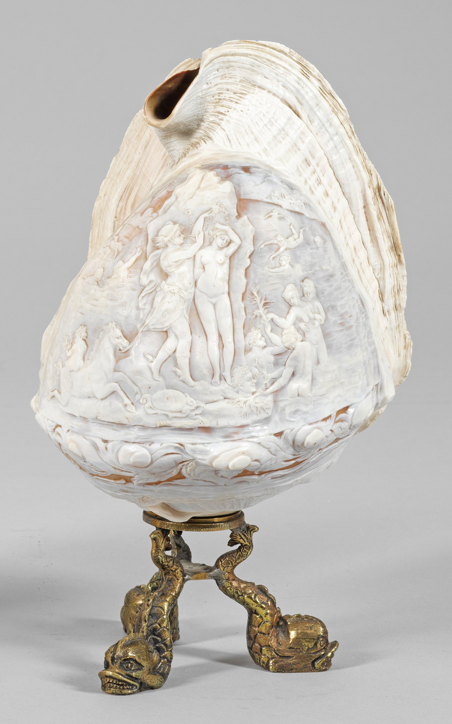 Dreibeiniger Delphinfuß aus Bronze als Träger für die ohrförmige Muschel. Rückseitig aufwendig geschnitzte Camée mit vielfiguriger mythologischer Szene "Perseus befreit Andromeda". Partiell unw. best.; Ges.-H. 33 cm.