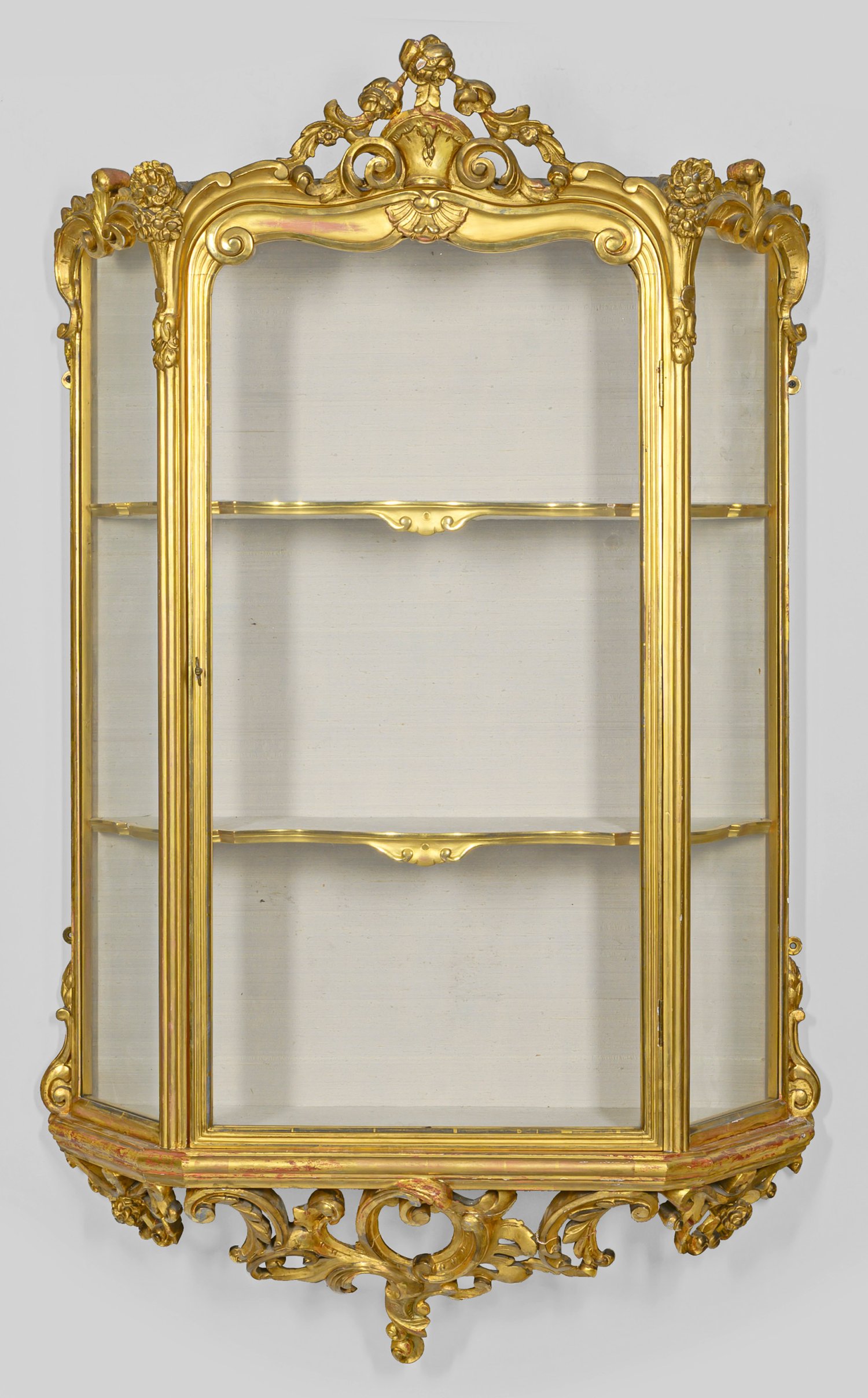 Holz, geschnitzt, gefasst und vergoldet. Hochrechteckiger, seitlich abgeschrägter, verglaster Korpus. In der Front große Vitrinentür. Durchbrochen gearbeitete Bekrönung aus Voluten und plastischen Rosenblüten sowie korrespondierender unterer Abschluss. H. 130 cm. 77 cm x 29 cm.