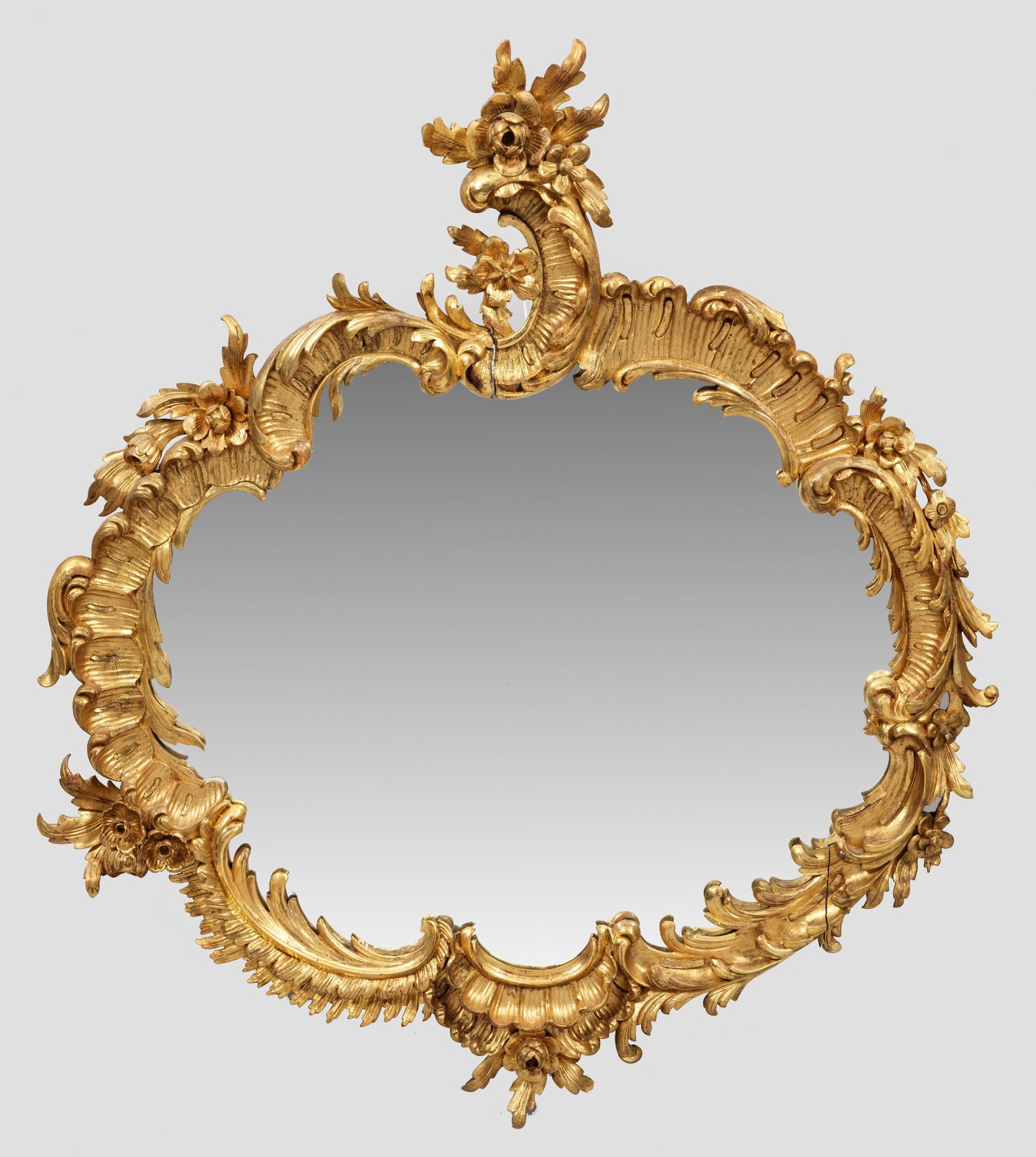 Holz, geschnitzt, gefasst und vergoldet. Kartuschenförmige, passig geschweifte Spiegelrahmung aus gegeneinander gestellten Voluten, Muschelwerk und plastischen Blüten mit korrespondierender Rocaillebekrönung. 100 cm x 85 cm.