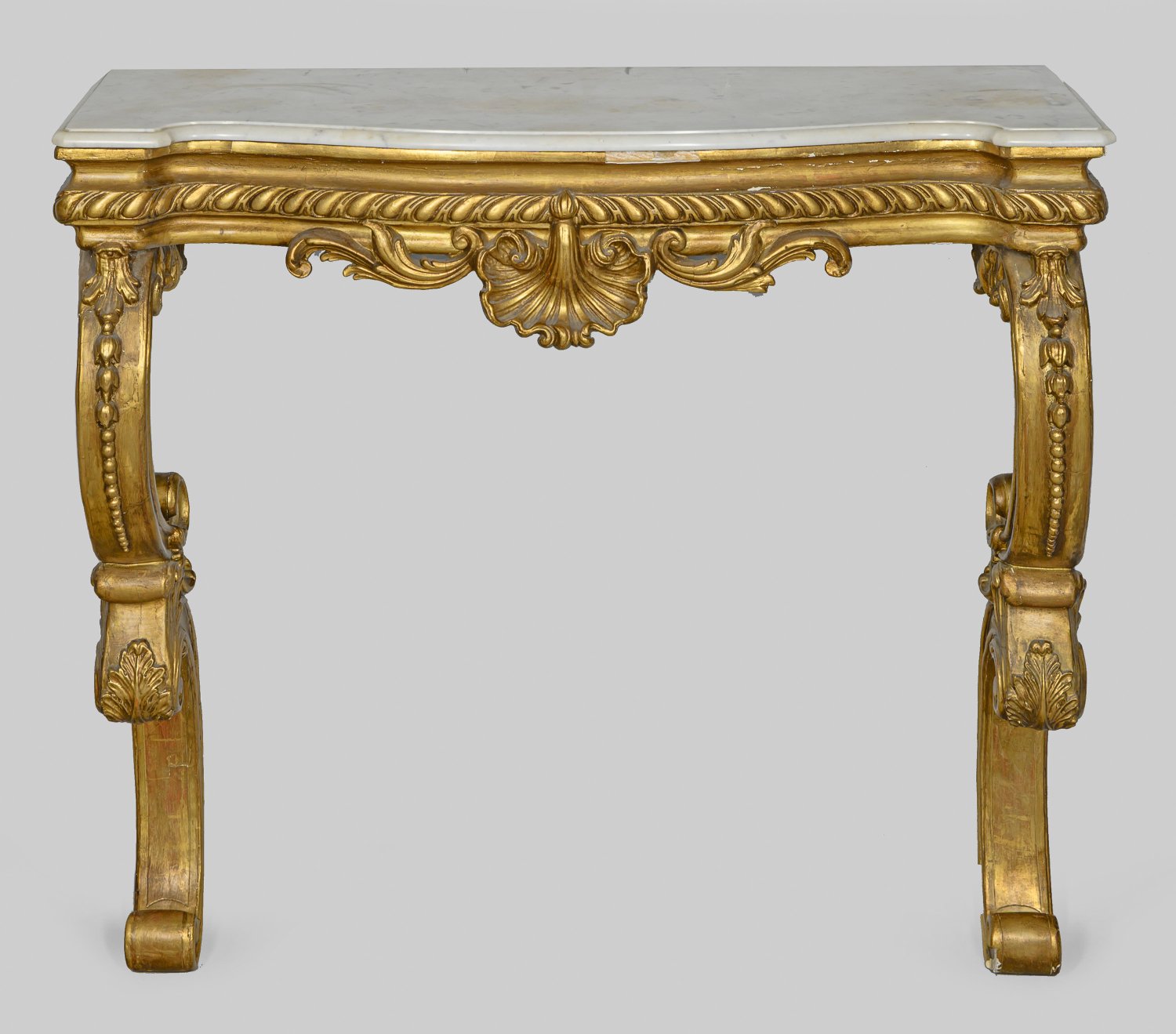 Holz, stuckiert, gefasst und vergoldet. Profilierte Zarge aus Eierstabfries, in der Front mit plastischem Muschelmotiv auf stark geschwungenen Beinen aus gegeneinander gestellten Voluten. Deckplatte aus weißem Marmor, H. 87,5 cm. 99 cm x 34 cm.