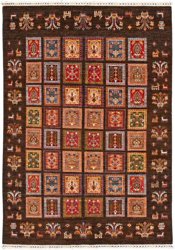 Afghanistan. Wolle auf Baumwolle. Auf dunkel abraschiertem Fond flächendeckende Musterung aus unterschiedlichen Feldern. Umlaufend offen gestaltete Rahmung aus Palmetten und stilisierten Tieren. 230 cm x 170 cm.