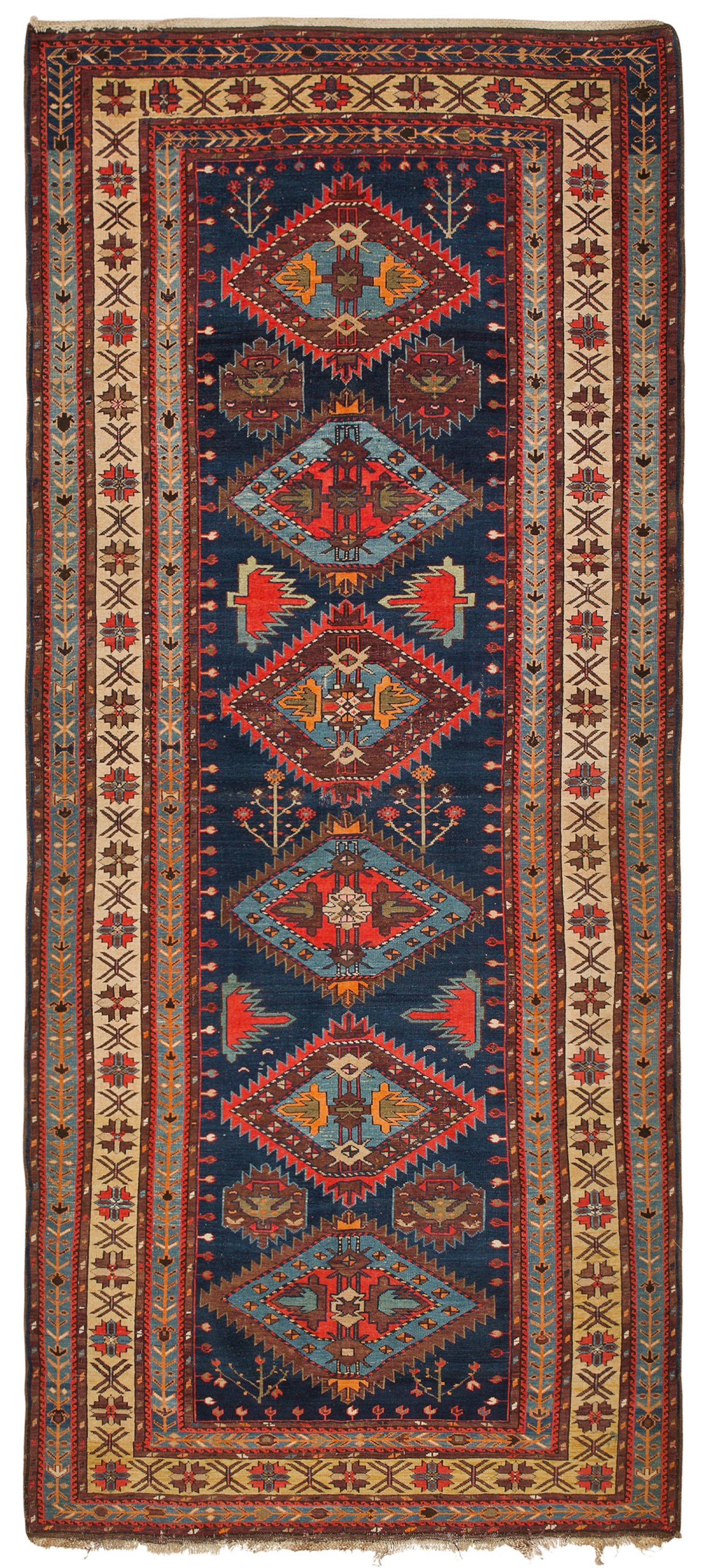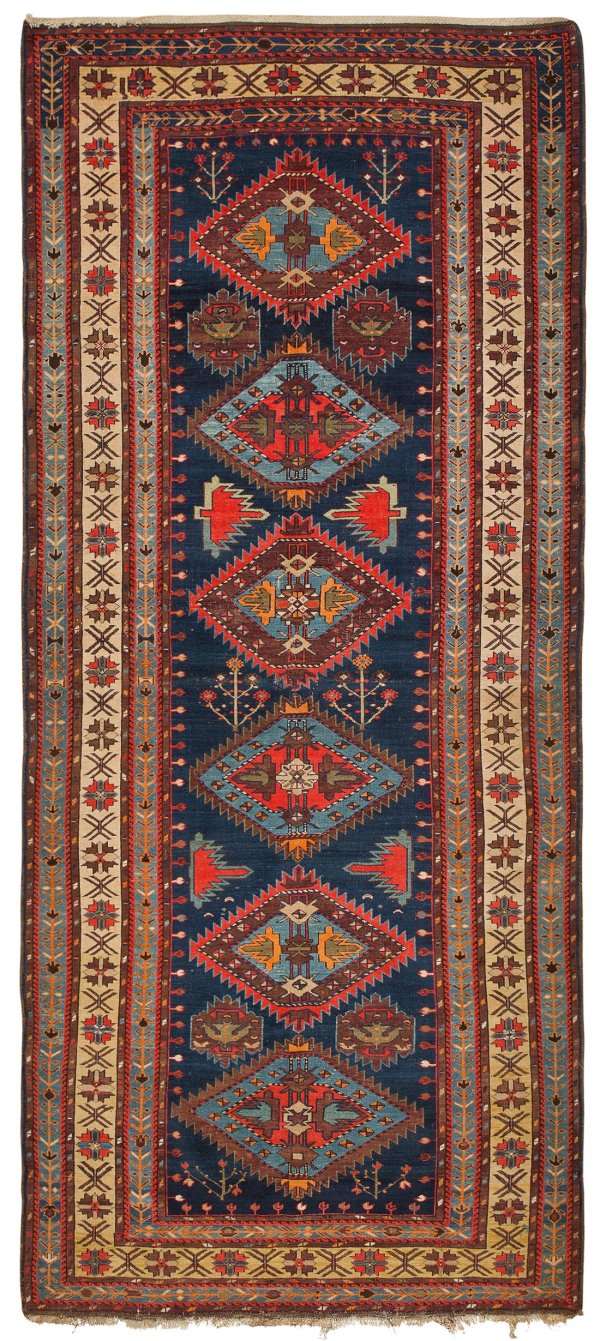 Kaukasus. Um 1920-1930. Wolle auf Wolle. Im dunkelblauen Innenfeld sechs große, gereihte Rautenmotive, umgeben von stilisierten Palmetten und Blütenzweigen. Umlaufend, mehrteilige Bordüre aus Rosettenmotiven und Blattwerk. 293 cm x 132 cm.