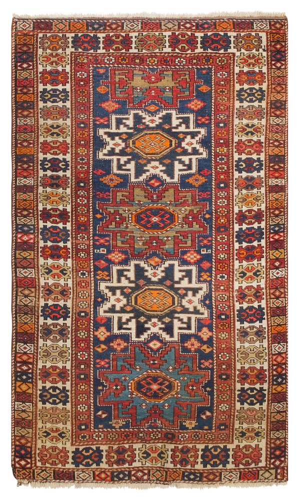 Kaukasus. 1. Hälfte 20. Jh.; Wolle auf Wolle. Im blauen Innenfeld dicht gereihte, sternförmige Medaillons sowie gestreute Musterung aus Rauten. Umlaufend breite, mehrteilige Ornamentbordüre. Rest.; 163 cm x 97 cm.