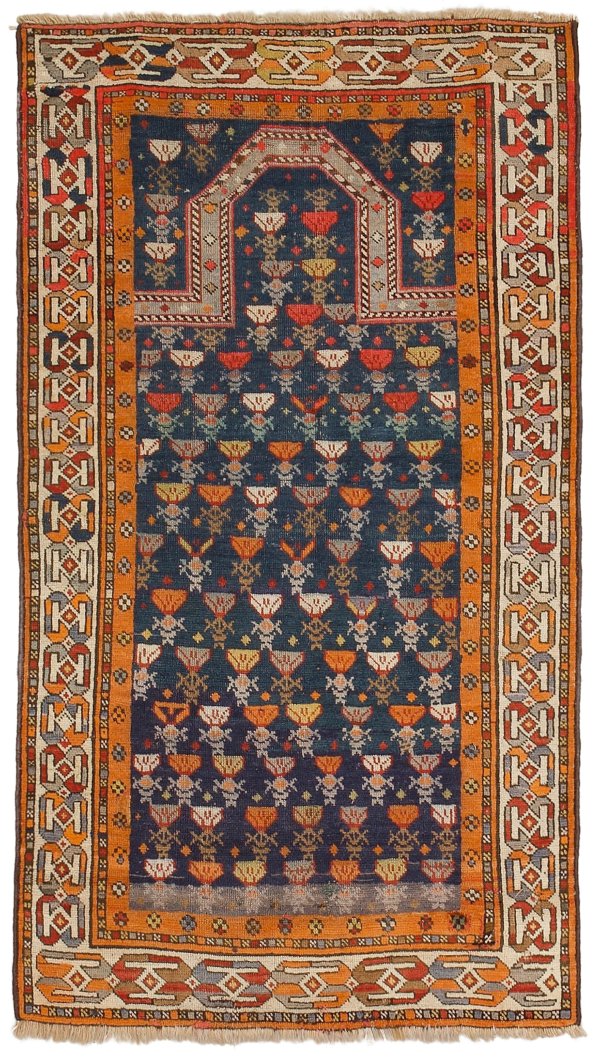 Kaukasus. Dagestan. Um 1910. Wolle auf Wolle. Im blauen Innenfeld flächendeckende Musterung aus stilisierten Kelchblüten im Rapport. Umlaufend beigefarbene Bordüre aus gereihten Kartuschen. 137 cm x 80 cm.