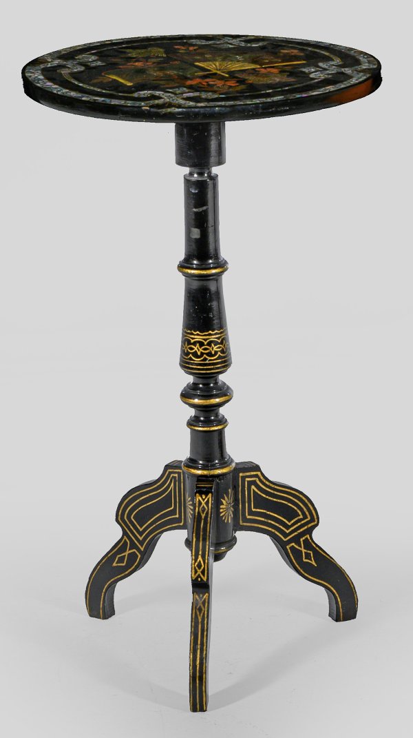 Holz und Papiermasché, polychrom bemalt sowie Einlagen aus Perlmutt. Mehrfach gegliederter Balusterschaft auf geschweiften Beinen als Träger für runde, abklappbare Deckplatte mit erhaben reliefiertem Fächermotiv, Blütenzweig und Vögel, umgeben von Bandeinlagen. H. 72 cm. D. 41 cm.