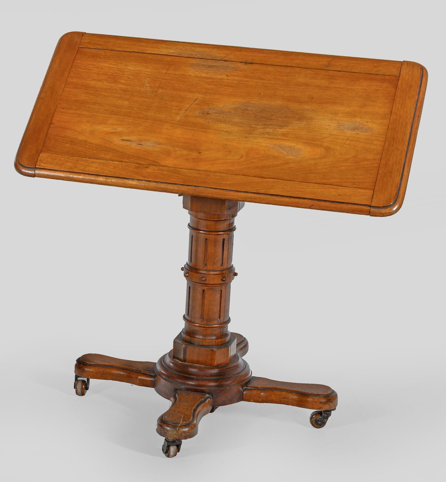 sog. Literary Machine. Mahagoni. Über kreuzförmig angelegten Stegen mit Rollen mehrfach gegliederter Säulenschaft. Oberhalb davon ausgehend höhenverstellbare sowie seitlich verschiebbare Stütze für rechteckige, umlaufend profilierte, abklapp- und schrägstellbare Deckplatte. Herstellerplakette. H. 73,5-122 cm. 83,5 cm x 40,5 cm.