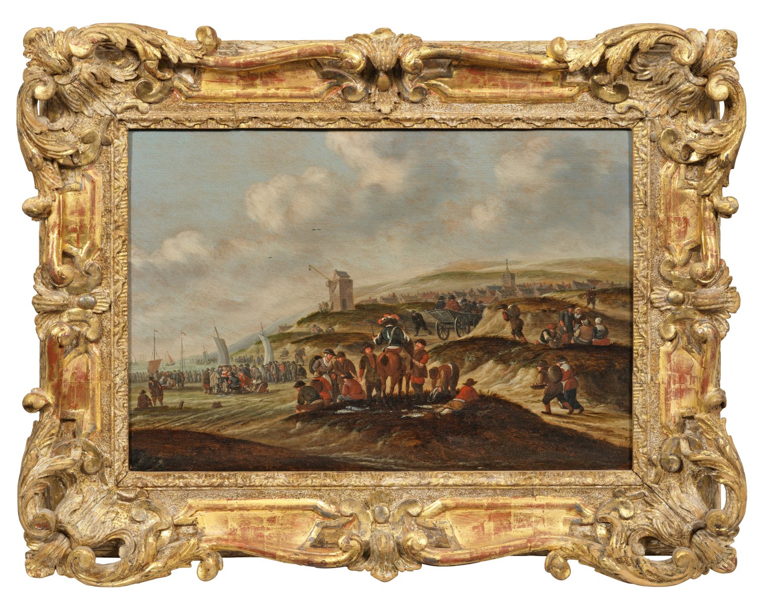 In toniger, fein nuancierter Farbpalette gemalte, überaus figurenreiche Strandszene mit atmosphärisch gestimmtem, lebendig bewölktem Himmel. Charakteristisches Werk Thomas Heeremans, der seit 1664 Mitglied der Lukasgilde in Haarlem war. Mit Vorliebe schuf er Kanallandschaften sowie Strand- und Dorfbilder im Winter und Sommer, die stilistische Verwandtschaft zu den Bildern des bekannten Landschafts- und Genremalers Claes Molenaer und Barend Gaels zeigen. Charakteristisch für Heeremans sind die zahlreichen phantasievollen Staffagefiguren, mit denen er seine Ansichten belebt. Werke des Künstlers befinden sich sowohl in bedeutenden niederländischen Museen als auch in vielen internationalen Sammlungen. Öl/Holztafel. Mittig u. sign. und dat. 1665. 29 cm x 42 cm. Rahmen.