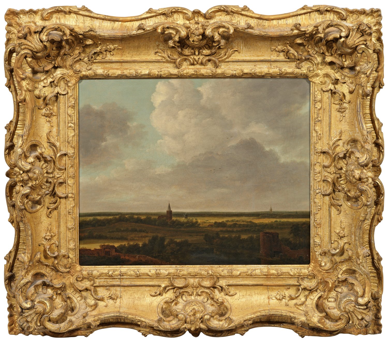 Unter grauen, stürmischen Wolken mit vereinzelt durchscheinenden Sonnenstrahlen erstreckt sich eine weite, flache Landschaft. Im Vordergrund rechts sind die Umrisse einer Ruine erkennbar, das Zentrum des Bildes wird von einem leicht nach links vesetzten Kirchturm bestimmt, während dahinter eine Windmühle und ein weiterer Kirchturm am Horizont zu erkennen sind. Dieses Landschaftsmotiv lässt sich auf zwei Werken van Ruysdaels nachweisen, die sich in der National Gallery in London befinden (Vgl. NG990 und NG2561). Assoziationen zu nordholländischen Landschaften um Haarlem, wo van Ruysdael aufwuchs und seine Ausbildung absolvierte, sind evident, doch der genaue topographische Standort sowie die Hauptkirche konnten nicht identifiziert werden, weshalb davon ausgegangen wird, dass es sich um eine idealisierte Landschaft handelt, die in dem vorliegenden Kabinettbild rezipiert wird. Öl/Lwd., doubliert. 43 cm x 48,2 cm. Rahmen.