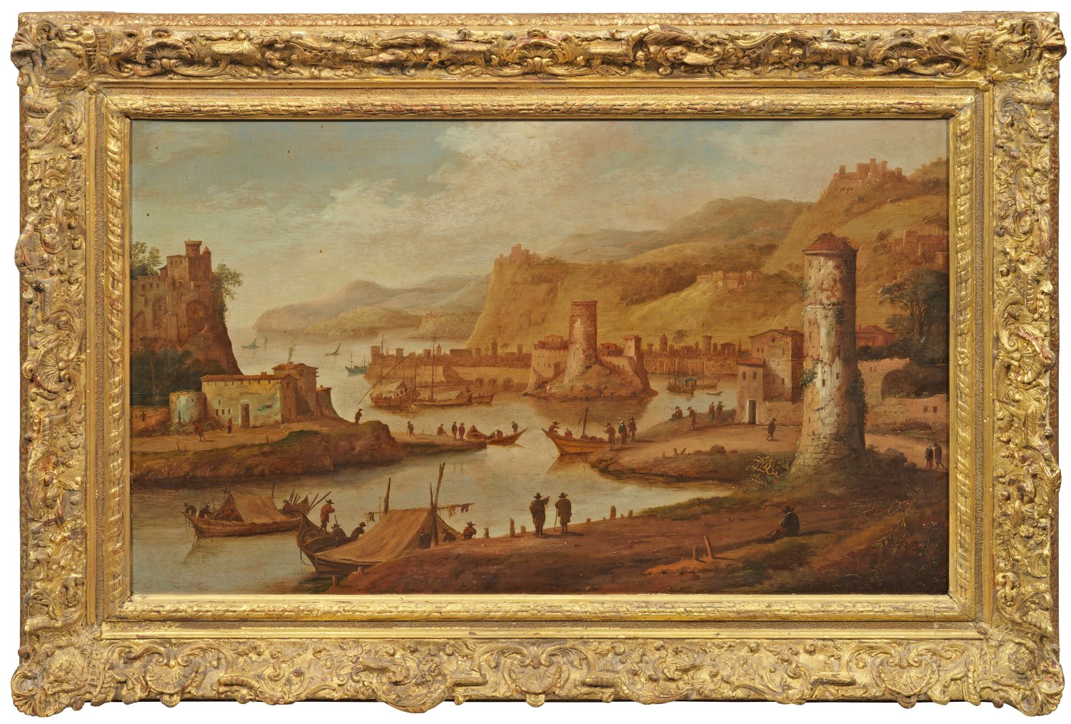 In warmer, erdiger Tonalität und ausgewogen harmonischer Komposition ausgeführte Schilderung einer befestigten Hafenbucht mit Wachtürmen, belebt von zahlreichen Schiffen, Lastkähnen und Figuren. Im Hintergrund erheben sich sanft begrünte Hügel mit weiteren Siedlungen und Burgen. In Motiv und Stil charakteristisches Werk des niederländischen Malers, der sich - inspiriert durch Stiche, Zeichnungen und Gemälde anderer Maler - auf die Darstellung italienisch anmutender Landschaften spezialisierte. Sein Tätigkeitsfeld beschränkte sich auf die Niederlande, wo er zunächst in Den Haag, dann in Haarlem und schließlich in Leiden tätig war. Öl/Eichenholztafel. Unten mittig monogr. D.V.H.; 51,5 cm x 84,7 cm. Rahmen.