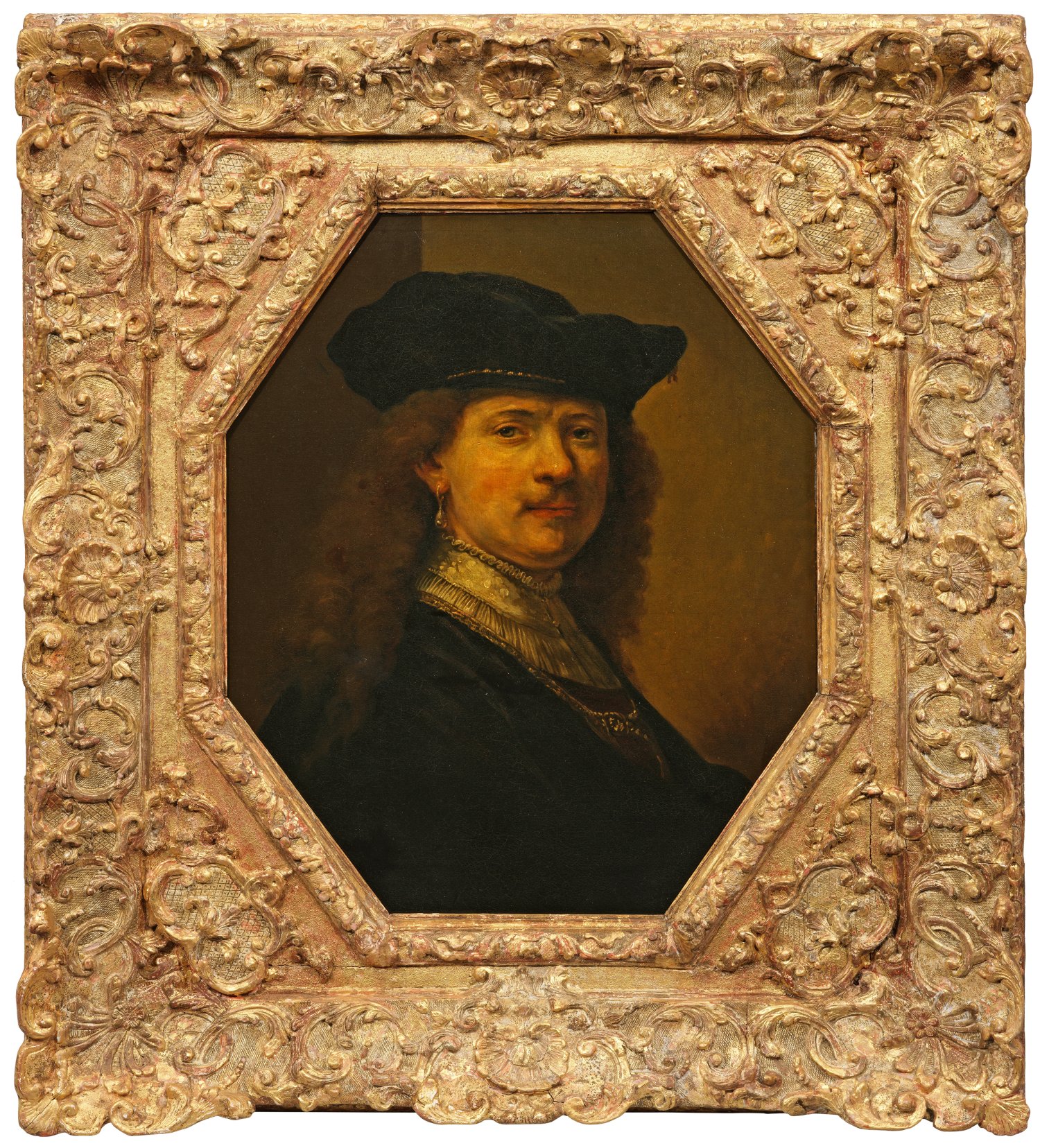 Wohl im 18. Jahrhundert entstandene, künstlerisch qualitätvolle und annähernd in Originalgröße ausgeführte Kopie des bekannten Werks "Autoportrait à la toque sur fond d'architecture", das Rembrandt mit möglicher Beteiligung seiner Werkstatt zugeschrieben wurde. Das Original stammt aus der Sammlung Ludwigs XVI. und befindet sich heute im Musée du Louvre in Paris (Inv.-Nr. 1746). In der vorliegenden Ausführung wurde der Fokus auf die Physiognomie des Porträtierten und dessen Kleidung mit aufwendigem Kragen und Schmuck gelegt, während der architektonische Hintergrund des originalen Gemäldes vernachlässigt wurde. Öl/Lwd., doubliert auf Hartfaserplatte. 85 cm x 54 cm. Rahmen.