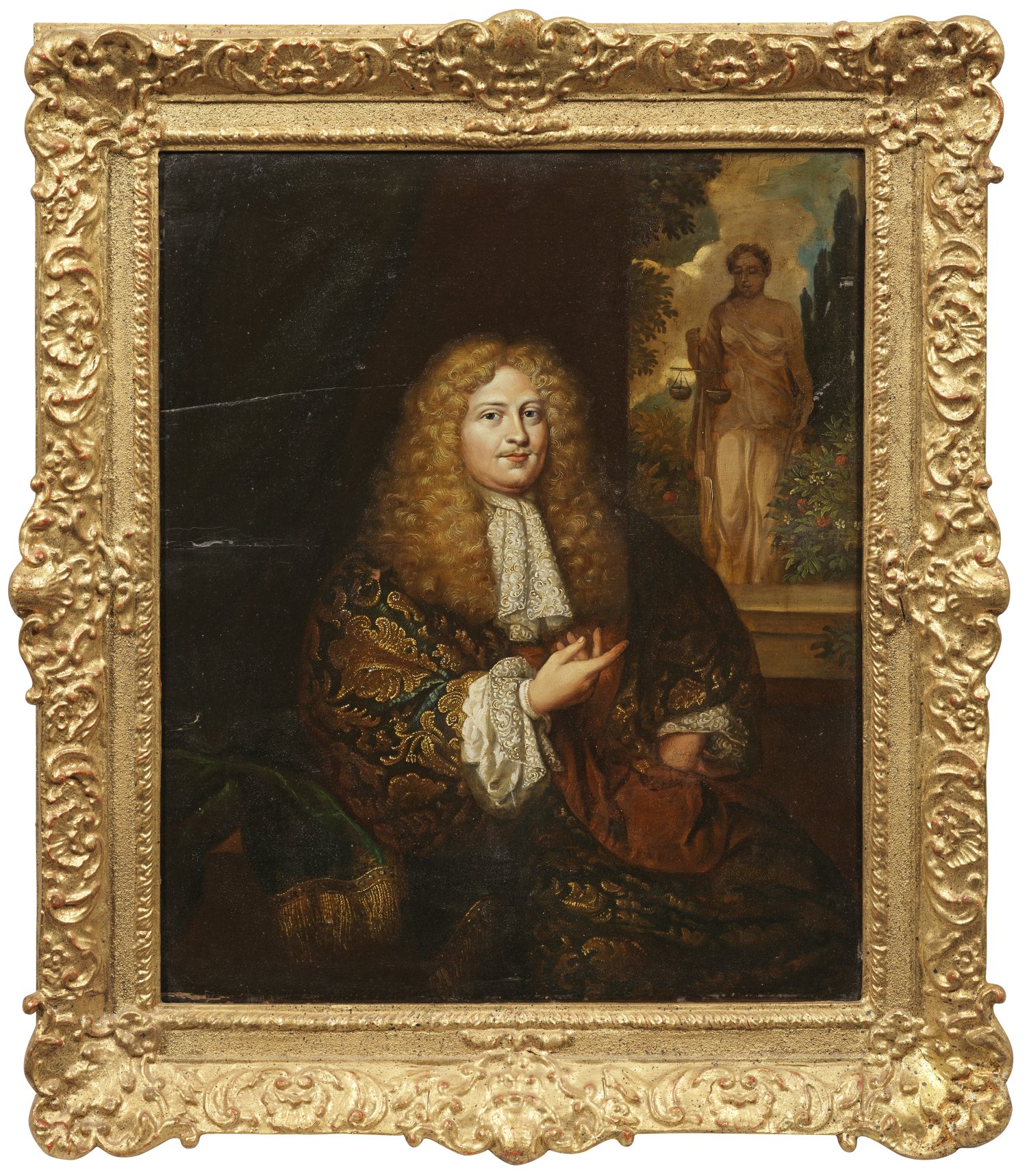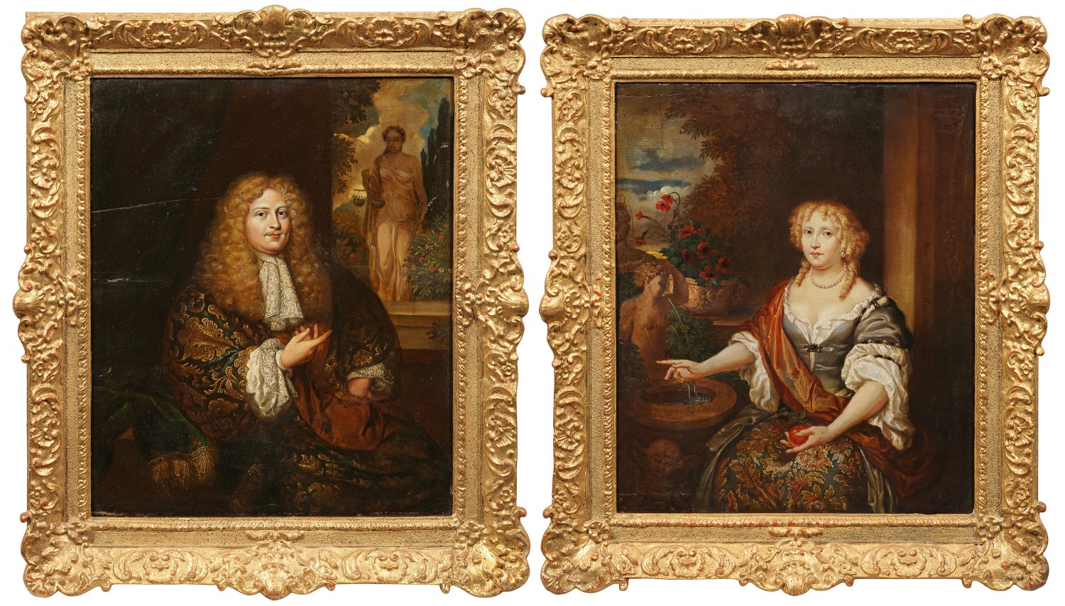 Gegenstücke. Feinmalerisch ausgeführte Darstellungen nach dem bekannten Gemäldepaar Netschers von 1679/80 in der Gemäldegalerie der Staatlichen Museen zu Berlin (Inv.-Nr. 850B und 850ßC), das sich zuvor bis 1893 in Berliner Privatbesitz befand. Die beiden Porträtierten sind ganz offensichtlich Angehörige einer sehr wohlhabenden Schicht von hohem Status, es dürfte sich mit Sicherheit um hochstehende Persönlichkeiten mit engeren Bezügen zum Haager Hof handeln. Auf beiden Bildnissen ist das Motiv der Orange zu sehen, augenfällige Hinweise auf die regierende Statthalterfamilie der Oranier in den Niederlanden. Der stattliche Herr wird in selbstbewusster, das Bild dominierende Pose dargestellt, die im Hintergrund platzierte Justitia-Statue ist wohl ein Hinweis auf seine Stellung als Richter oder Magistrat. Im Gegensatz hierzu ist die porträtierte Dame, graziler und zierlicher geschildert, ihr üppiger Perlenschmuck symbolisiert nicht nur Reichtum, sondern kann sich auf auch andere Eigenschaften wie Reinheit, Liebe, Keuschheit und Schönheit beziehen. Öl/Holztafel. 60 cm x 50 cm. Rahmen.