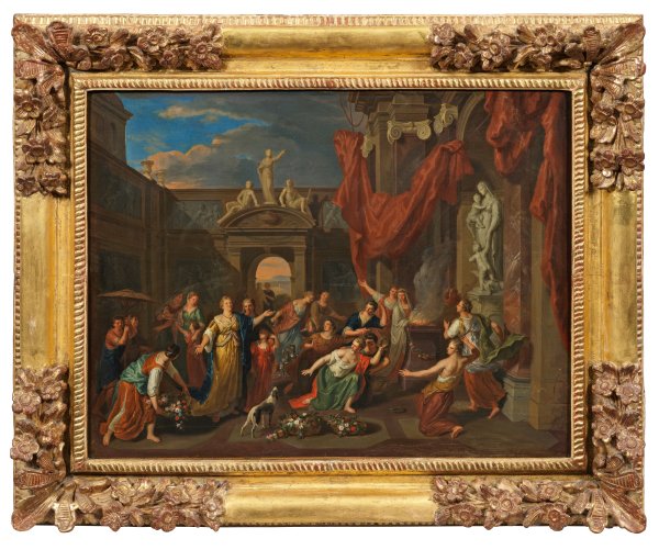 In feinmalerischer Manier und subtil nuanciertem Kolorit ausgeführte, aufwendig arrangierte Szene in antiker Säulenarchitektur. Vor der erhaben inszenierten Statue der Venus bietet eine Vielzahl von Frauen bunte Blumengirlanden und -bouquets als Opfergaben dar. Stil- und motivtypisches Werk Hoets, der bei Warnard van Rysen und Cornelius van Poelenburgh, einem der ersten niederländischen Landschaftsmaler im italienischen Stil, lernte. 1672 ließ sich Hoet in Den Haag nieder, hielt sich anschließend einige Zeit in Amsterdam und Paris auf und kehrte über Brüssel in die Niederlande zurück, wo er 1697 zusammen mit Hendrick Schoock eine Zeichenakademie in Utrecht gründete. 1714 ging er erneut nach Den Haag, wo er den Rest seines Lebens verbrachte. Er schuf überwiegend religiöse und mythologische Motive, die er - beeinflusst durch seinen Lehrer Cornelius van Poelenburgh - in italienischer Landschaft mit Ruinen oder in antiker Säulenarchitektur mit Statuen inszenierte. Die vorliegende Arbeit stellt ein treffliches Beispiel dafür dar, vergleichbare Werke befinden sich u.a. in der Bayerischen Staatsgemäldesammlung im Neuen Schloss Bayreuth (vgl. Inv.-Nr. 1969, 1104 und 1955). Öl/Lwd., doubliert. R. u. sign. "G. Hoet". Verso versch. Ausstellungs-/Inventarnummern. 56 cm x 70 cm. Rahmen.