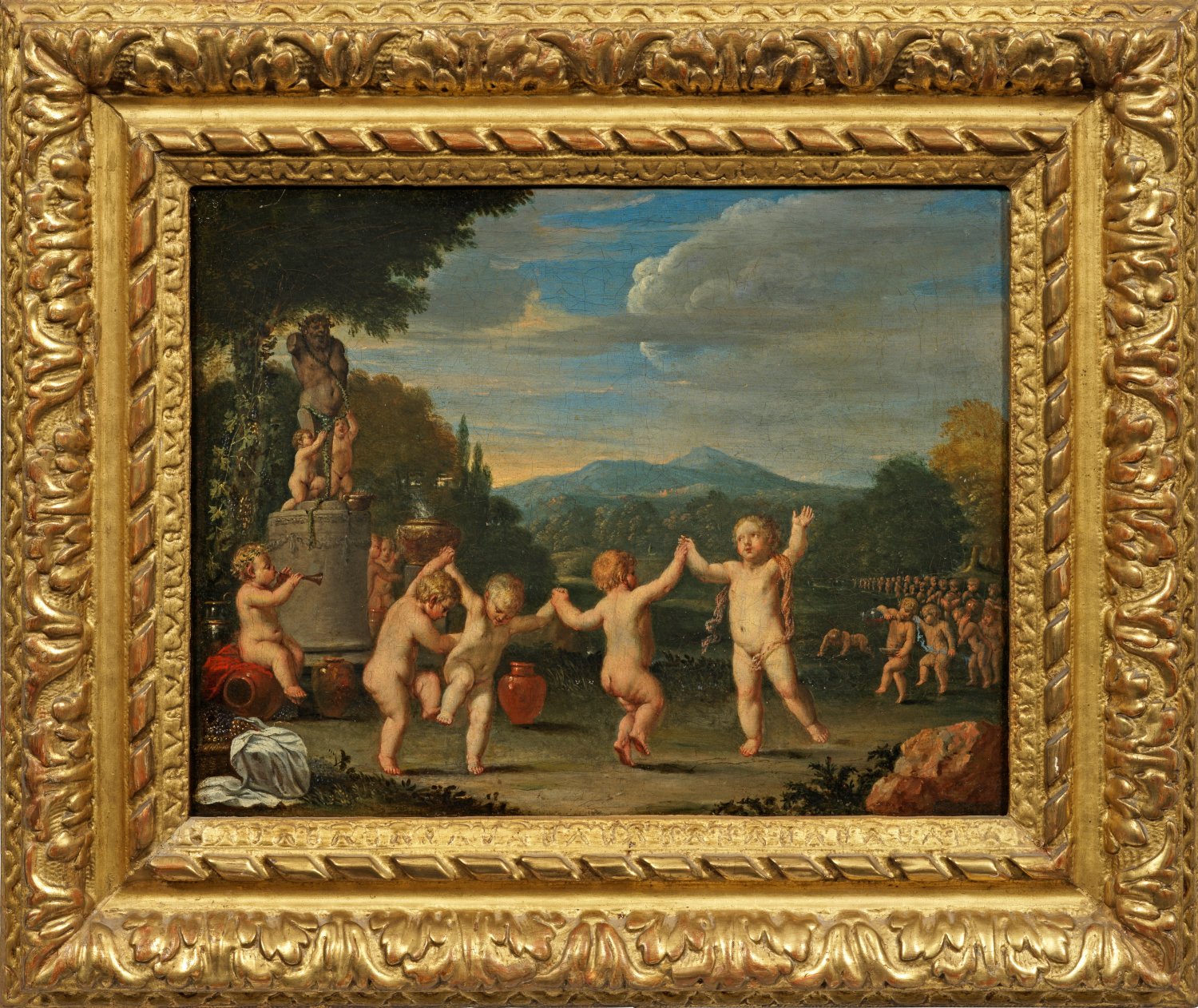 Heitere, ausgelassene Szene in arkadischer Landschaft mit einer Vielzahl tanzender, springender, singender und musizierender Knaben, die einer Bacchusstatue huldigen. Feinflüssig gemalte, in leuchtendem Kolorit und effektvoller Lichtbehandlung ausgeführte, mythologische Darstellung, die deutliche Reminiszenzen zu motivähnlichen Werken flämischer Meister wie Jan van Balen (1611-1654) oder Peeter van Avont (1660 -1652) aufweist. Öl/Lwd., doubliert. Verso bez. "van Balen". 28 cm x 36 cm. Rahmen.