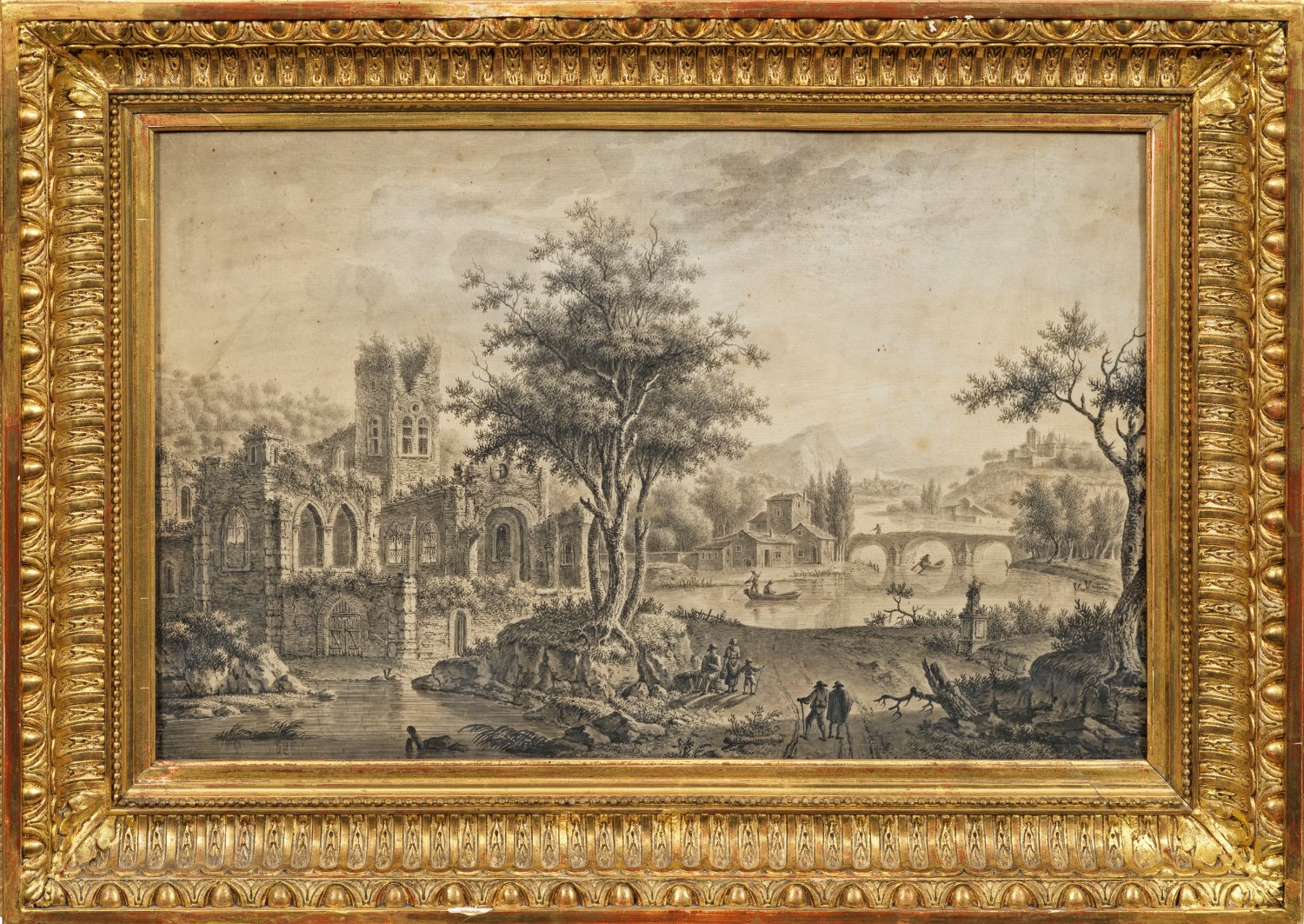 Reizvolle, romantisch gestimmte Landschaft mit bewachsener Ruine an einem gewundenen, breiten Flusslauf, an dessen Ufer malerische Landhäuser, ein Dorf und eine Burganlage gelegen sind. Die Umgebung ist dicht bewachsen mit Büschen und Bäumen und wird von einer Vielzahl von Wanderern, Bauern und Fischern belebt. Subtil geschilderte, äußerst detailreich angelegte Komposition mit deutlichen Assoziationen zu den Arbeiten von Jacob Philipp Hackert, Ferdinand von Kobell und Jacob Cats. Lavierte Tuschfederzeichnung/Papier. 26,8 cm x 41,8 cm (Sichtmaß). Rahmen.