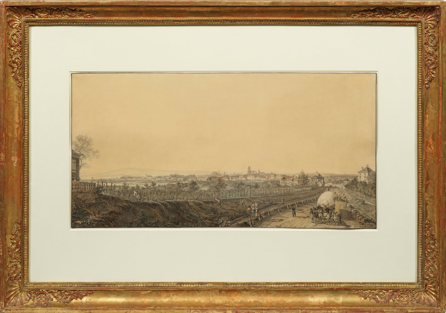 Detailreiche und subtil geschilderte Vedute, die als Vorlage für eine von Johann Georg Reinheimer gestochene und verlegte Umrissradierung diente. Morgenstern stammte aus einer bedeutenden, ursprünglich thüringischen Künstlerfamilie und erhielt ersten Unterricht bei seinem Vater, dem Kirchenmaler Johann Ludwig Ernst Morgenstern. Er bildete sich an der Dresdner Akademie bei dem Landschaftsmaler Johann Christian Klengel weiter und spezialisierte sich letztlich auf Architektur- und Landschaftsbilder seiner Heimatstadt Frankfurt und deren Umgebung, womit er ein bedeutendes und umfangreiches zeitgeschichtliches Zeugnis für die Entwicklung des Frankfurter Stadtbildes in der ersten Hälfte des 19. Jhs. schuf. Gemäß der Familientradition trat auch sein Sohn, der angesehene Landschaftsmaler Carl Morgenstern, in die Fußstapfen seines Vaters. Aquarellierte Federzeichnung/Papier. R. u. sign.; 38 cm x 70,5 cm. Rahmen.