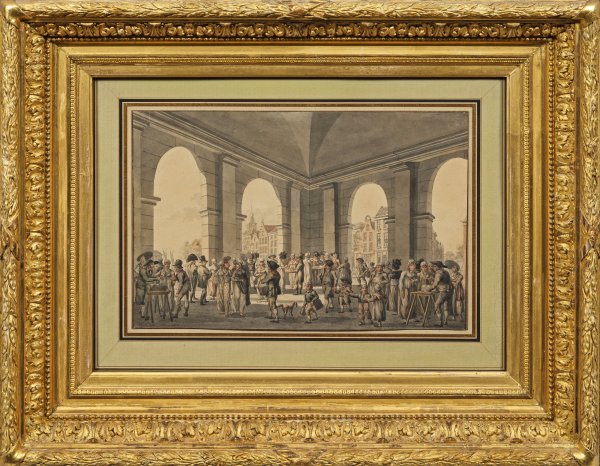 Unter den Arkaden der Markthalle einer Hafenstadt herrscht ein reges Treiben: zahlreiche Besucher, darunter auch Kinder und ein Hund, flanieren entlang der Stände, zwischen den Händlern mit Bauchläden und begutachten, probieren und feilschen um den angebotenen Käse. In Stil und Sujet repräsentative Arbeit Langendyks, der als Zeichner und Grafiker tätig und der Sohn und Schüler von Dirk Langendyk (1748-1805) war. Lavierte Federzeichnung und Aquarell/Papier. L. u. sign. und dat. 1805. 22,3 cm x 32,7 cm. Rahmen.