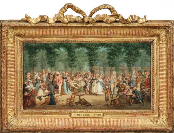 1792 erschien die gleichnamige Farbaquatintaradierung Debucourts und alles spricht dafür, dieses so feinmalerisch und detailreich ausgeführte Kabinettbild ebenfalls dem Künstler zuzuschreiben. Inspiriert von Thomas Rowlandsons "Vauxhall Gardens" (1785) zeigt "La Promenade Publique" eine Menschenmenge, die sich in einem Park im Zentrum von Paris versammelt hat und sich gegenseitig bewundert. Auf den ersten Blick wirkt das Werk wie eine rein fiktive Satire, doch wagte es Debucourt auch reale, berühmte Persönlichkeiten des französischen Adels einzufügen: den Herzog von Aumount, der sich hier auf drei Stühlen im Zentrum der Komposition lümmelt oder den Herzog von Chartres (späterer König Ludwig XVIII.). Es gibt einen letzten Einblick in die Sitten und das Leben des Ancien Régime, dessen selbstverliebte Figuren noch nicht ahnen, dass ihre extravagante, ruhige, dekadente Welt innerhalb weniger Wochen zusammenbrechen wird und viele Einwohner von Paris und ganz Frankreich nach dem Tuileriensturm (10. 08.1792) in den Jahren der Terrorherrschaft 1793/94 zum Opfer fallen werden. Öl/Eichenholztafel. 11,6 cm x 22 cm. Louis XVI-Rahmen.