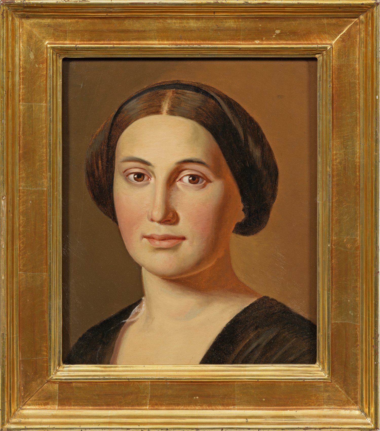 In fein nuancierter Palette und weichem Pinselstrich gemalte Darstellung einer jungen, dunkelhaarigen Frau, die den Betrachter eindringlich anblickt. Öl/festes Papier. 35 cm x 29 cm. Rahmen.