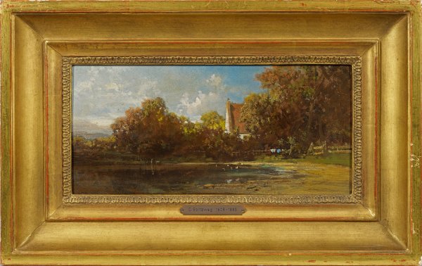 Blick auf eine sommerliche, lichtdurchflutete Landschaft. Deren Vordergrund wird fast in seiner gesamten Breite von dem flachen Teich eingenommen, darauf zum jenseitigen Ufer fünf weiße Enten, dahinter ein Gatterzaun mit darüber gelegten Wäschestücken. Auf der rechten Bildseite ragen hohe Büsche und Eichen vor dem weißen Haus mit rotem Ziegeldach auf, links ein Wehr sowie weitere Büsche bzw. Weidenbäume, dahinter das sanft hügelige Land unter einem duftig bewölkten, lichtblauem Himmel mit Vogelflug. Bei dem vorliegenden, um 1860 entstandenen Werk Spitzwegs ist der große, prägende Einfluss der Schule von Barbizon augenfällig, mit der er die Landschaft, deren Stimmung und das Licht einfing. Spitzweg, seit 1835 Mitglied des Münchener Kunstvereins, stellte ab 1839 vielfach erfolgreich aus. Anfangs schilderte er zunächst das beschauliche Leben des biedermeierlichen Bürgertums und kauzige Sonderlinge. In seinen späteren Werken wurde das Landschaftliche immer wichtiger, beeinflusst insbesondere durch den eng befreundeten Eduard Schleich d. Ä., der als bedeutender Wegbereiter der Freilichtmalerei in Deutschland gilt. Mit ihm unternahm Spitzweg zahlreiche Reisen, u. a. 1851 nach Paris, wo die Schule von Barbizon großen Eindruck auf beide Künstler machte. Auch in diesem Gemälde Spitzwegs zeigt er dies in einer freieren, flächigeren Malweise, bei der es Spitzweg um die Gesamtstimmung ging, die hier durch das Licht gesteigert wird. Spitzweg wurde hierdurch zu einem der Wegbereiter des Impressionismus in Deutschland. Öl/Holztafel. L. u. geritzte Signatur ("S" im Rhombus, Signatur-Typus um 1860). Verso Etikett der Ausstellung "Carl-Spitzweg und sein Freundeskreis", Haus der Kunst, München 1967 mit Nr. 61. 14,5 cm x 30 cm. Rahmen.