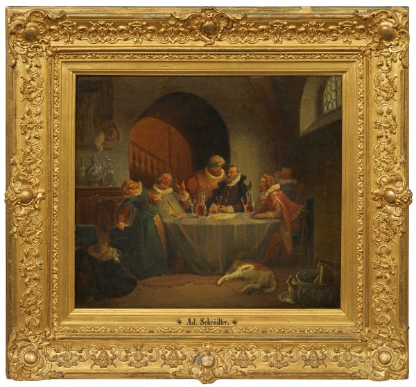 Fein lasierend und nuanciert ausgeführte Szene, die eine fröhliche Gesellschaft des 17. Jhs. schildert, die sich für ein gemütliches, weinseeliges Stelldichein um einen Tisch versammelt hat. Charakteristisches, historisch rückgreifendes Genrebild Schroedters, der 1827-1829 die Berliner Kunstakademie besuchte und anschließend bei Wilhelm Schadow an der Düsseldorfer Akademie lernte. Öl/Lwd.; L. u. Malersignet (Korkenzeieher) mit Dat. 1849. Verso Stempel "Eigentum des Kunstvereins für das Großherzogtum Baden". 36 cm x 41,5 cm. Rahmen.