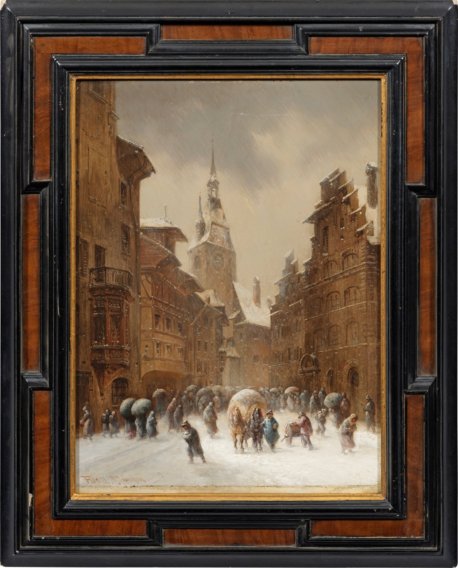 Händler mit Fuhrwerken, Passanten und andere Personen kämpfen sich teils mit Schirmen durch das heftige Schneetreiben in einer pittoresken Gasse der Nürnberger Altstadt. In fein nuanciertem Kolorit flüssig gemaltes Werk, das in Stil und winterlichem Motiv charakteristisch im Oeuvre des Münchner Malers ist. Anton Doll gehörte zu den populären Kleinmeistern der Münchner Schule, der in unzähligen Bildern das beschauliche Treiben der Bevölkerung des Münchner Umlands und der Voralpenregion wiedergegeben hat. Öl/Mahagonitafel. R. u. sign. mit Ortsangabe München. 39,5 cm x 30,5 cm. Rahmen.