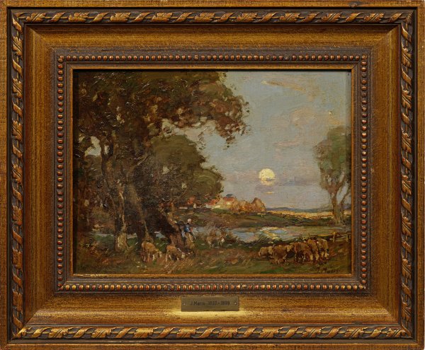 In bewegtem, pastosem Pinselstrich und effektvoller Lichtbehandlung ausgeführte Landschaftsimpression mit einer Hirtin und ihren Schafen, die am Flussufer eindächtig grasen, während der Mond bereits hinter einer malerischen Dorfkulisse aufgegangen ist. Charakteristische, atmosphärische Arbeit Maris', der in Den Haag und Antwerpen ausgebildet wurde. Auf der Suche nach spannenden Neuerungen fern der akademischen Konventionen, schloss sich Maris zusammen mit seinen Brüdern der Haager Schule an, die in der Nachfolge der Schule von Barbizon stand. Öl/Lwd., kaschiert auf Karton. R. u. sign.; 22,5 cm x 30,5 cm. Rahmen.