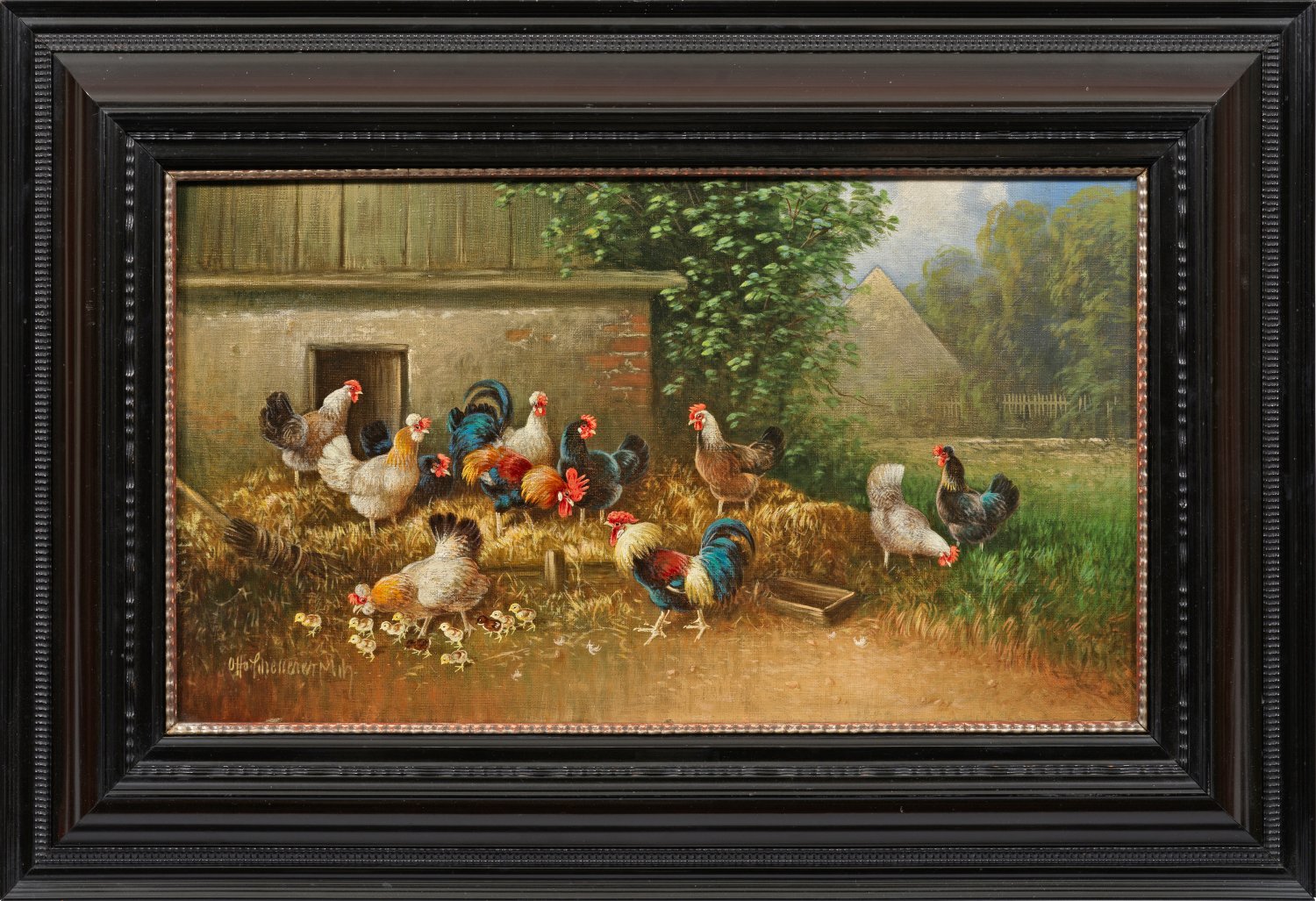 Sommerlich heiter gestimmte Schilderung eines Heuhaufens hinter dem Stall, auf dem sich Hühner, Hähne und Küken tummeln. Charakteristisches, sehr lebendig wiedergegebenes Tierstück Otto Scheuerers, der bei Karl Raupp in München lernte und in die künstlerischen Fußstapfen seines älteren Bruders Julius Scheuerer (1859 - 1913) trat. Öl/Lwd.; L. u. sign. mit Ortsangabe München. 31,2 cm x 54 cm. Rahmen.