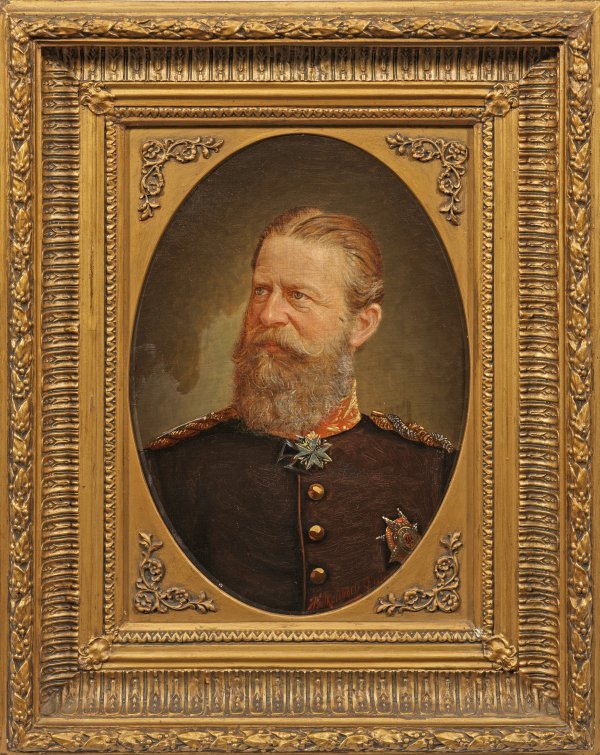 Repräsentatives, fein gemaltes, posthumes Brustbildnis des Kaisers in Uniform (1831-1888) aus dem Haus Hohenzollern, Sohn von Kaiser Wilhelm I. und Vater Kaiser Wilhelm II., Friedrich III. war in seinem Todesjahr - dem legendären Dreikaiserjahr - nach 28 Jahren dauernder Kronprinzenzeit für 99 Tage König von Preußen und zugleich Deutscher Kaiser. Im Deutschen Krieg 1866 und im Deutsch-Französischen 1870/71 Krieg führte er jeweils eine Armee des preußischen Heeres. Öl/Lwd.; R. u. sign. u. dat. 1890. 46 cm x 38 cm. Prunkrahmen.