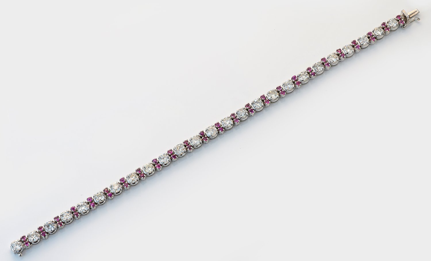 Bracelet set with 25 diamonds each approx. 0,20 ct., total approx. 5,00 ct. (F-H/si-i) and rubies approx. 0,50 ct., in 18 k white gold.