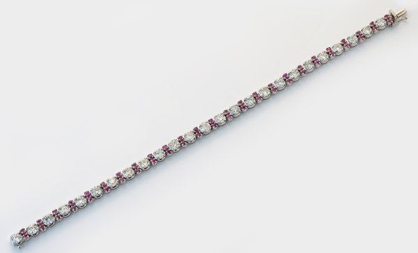 Weißgold, gest. 750. Linear besetzt mit 25 Brillanten sowie Altschliffdiamanten von jeweils 0,20 ct., zus. 5,00 ct. (F-H/si-i), akzentuiert durch pinkfarbene Rubine von zus. ca. 0,50 ct.; Gew. ca. 18,34 g.