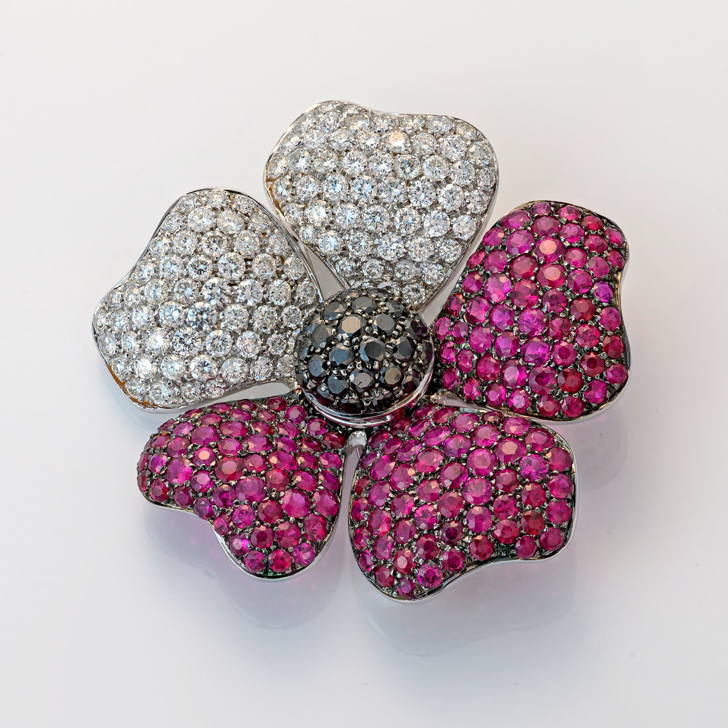 Flower brooch set with pink and pigeon blood red rubies approx. 8,00 ct., diamonds approx. 5,20 ct. (F-G/vs-si/i) and black diamonds approx. 1,00 ct., in 18 k white gold.
