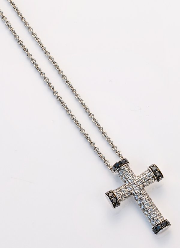 Cross pendant set with white and black diamonds approx. 0,91 ct., with necklace, in 14 k white gold and platinum.