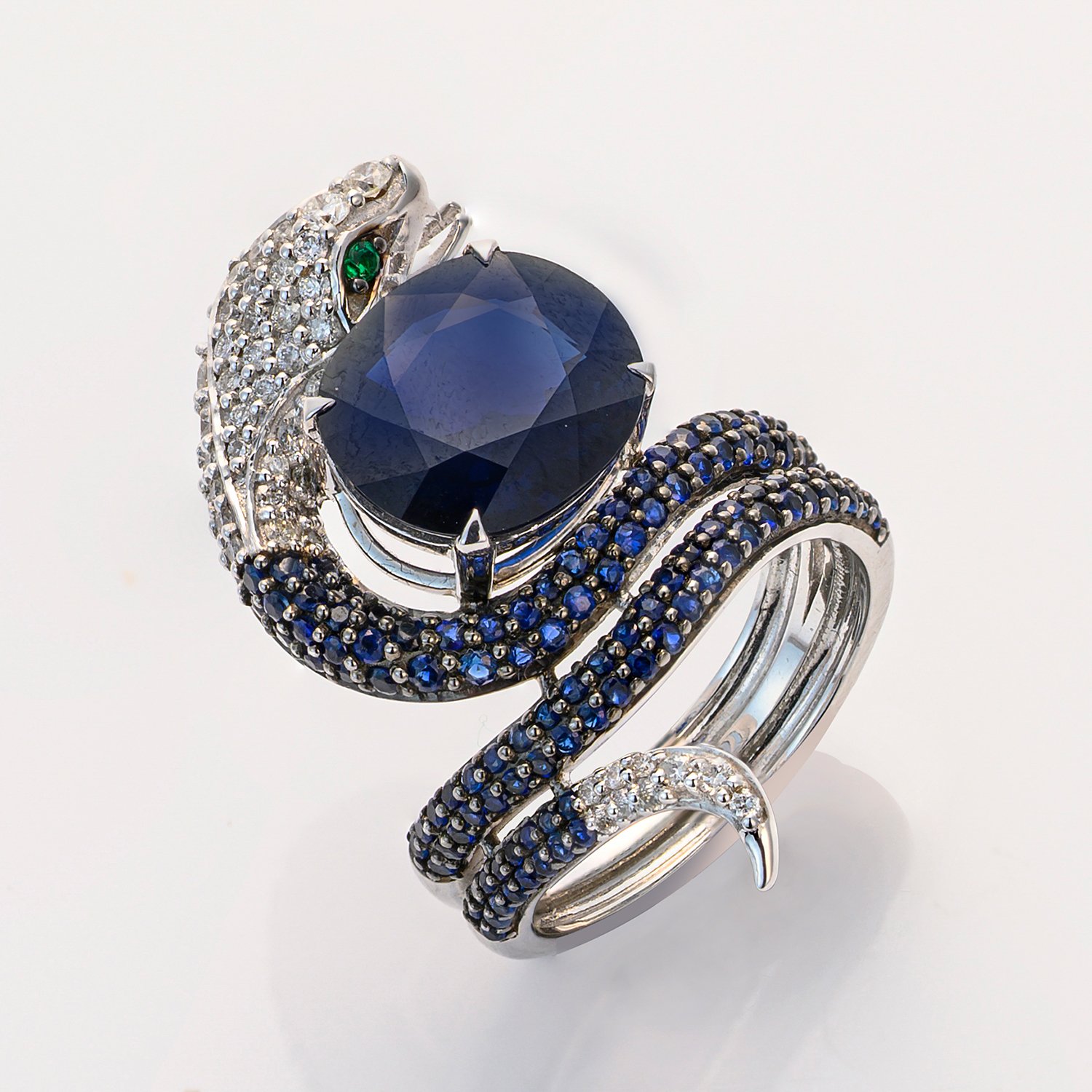 Snake ring set with a royal blue sapphire (no indication of heat and treatment) approx. 5,17 ct., diamonds and sapphires approx. 0,60 ct., in 18 k white gold. Certificate included.