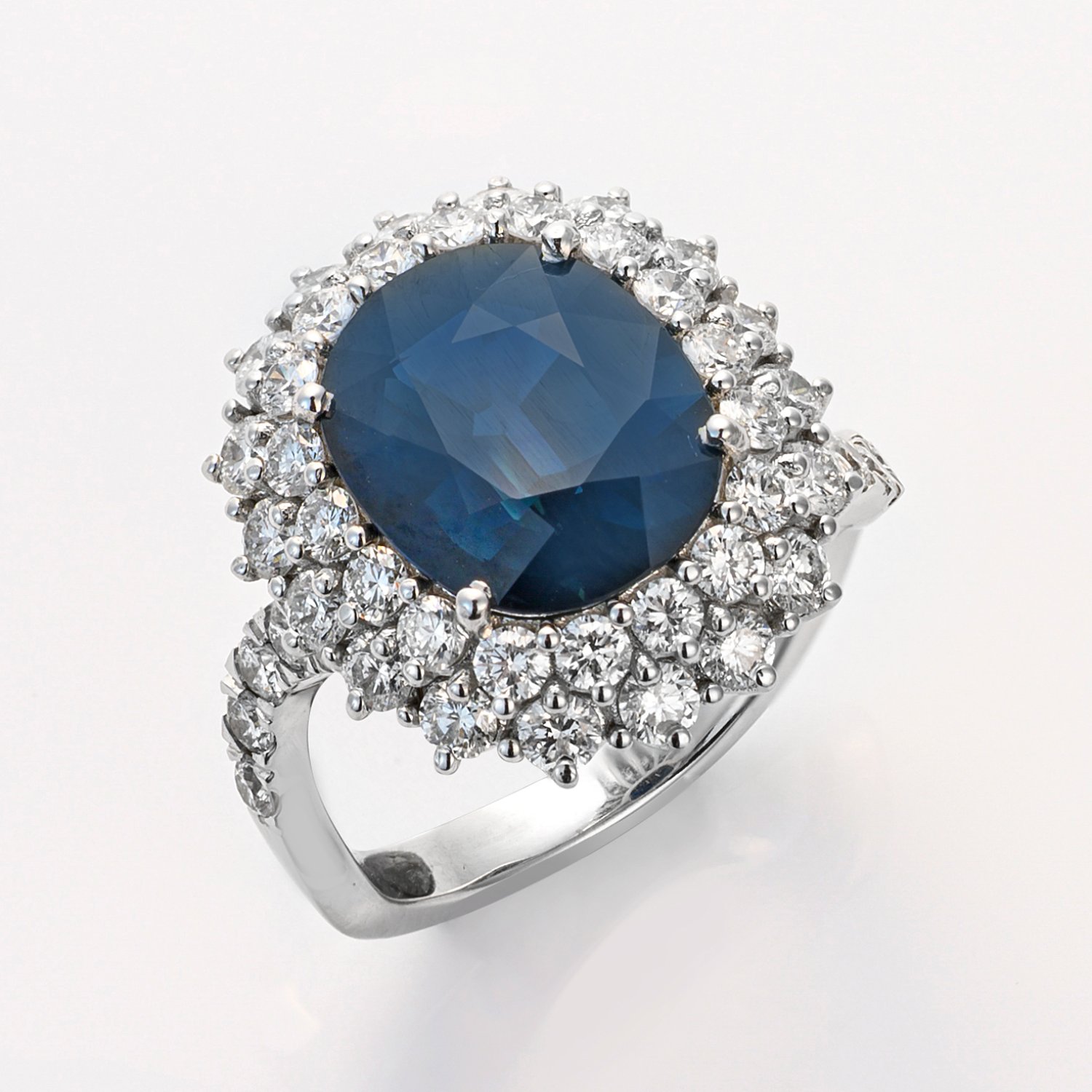 Weißgold, gest. 750. Zentral besetzt mit einem unbehandelten royalblauen Saphir von ca. 5,34 ct., entouriert von Brillanten von zus. ca. 1,91 ct. (H-J/si). Gew. ca. 7,67 g.