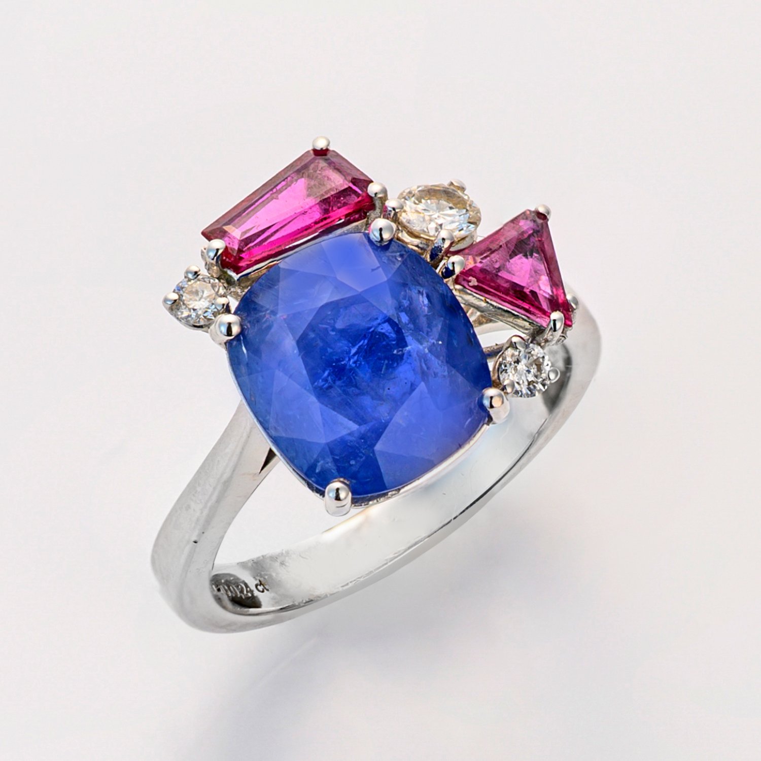 Weißgold, gest. 750. Zentral besetzt mit einem unbehandelten kornblumenblauen Saphir von ca. 4,11 ct. im Cushioncut und 2 taubenblutroten Rubinen von zus. ca. 0,77 ct., akzentuiert durch Brillanten von zus. ca. 0,24 ct.; Gew. ca. 5,99 g.
