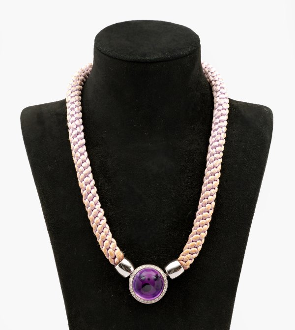 Weißgold, gest. 750. Hellviolettes Satin-Kordelband, mittig eingesetzter Anhänger mit fliederfarbenem Amethystcabochon von ca. 30 ct., entouriert von Brillanten von zus. ca. 0,50 ct.; Anhänger-Gew. ca. 12,90 g.