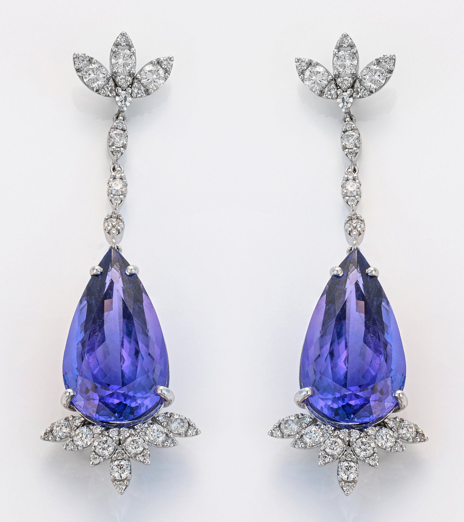 Weißgold, gest. 750. Schauseitig besetzt mit Brillanten von zus. ca. 1,23 ct. und abschließenden blauvioletten Tansaniten von zus. ca. 17,24 ct. im Tropfenschliff. Ges.-Gew. ca. 9,22 g.
