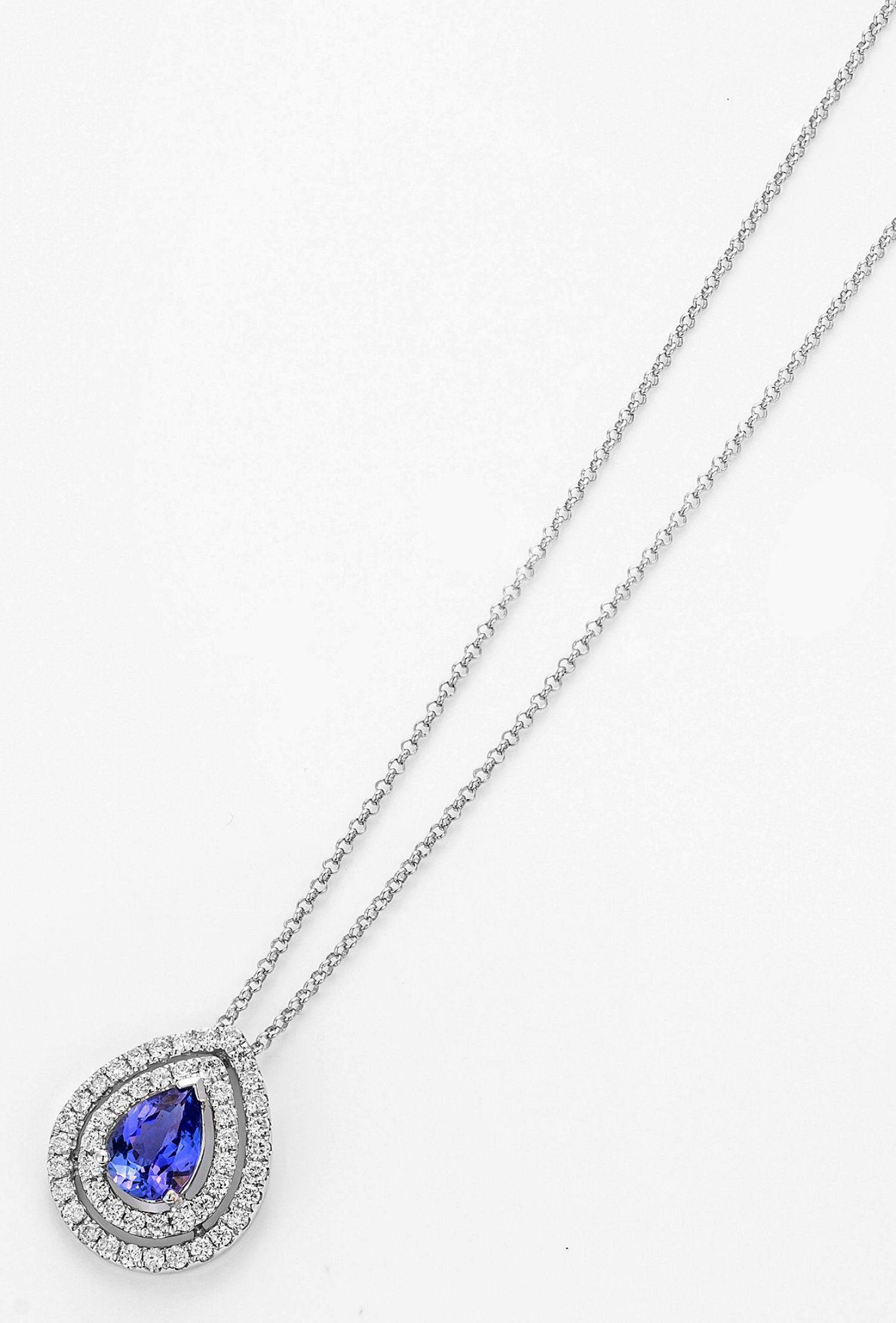 Weißgold, gest. 750. Zentral besetzt mit einem blau-violetten Tansanit von ca. 1,10 ct. im Tropfenschliff, entouriert von Brillanten von zus. ca. 0,50 ct. (G-H/si), an feiner Gliederkette. Ges.-Gew. ca. 4,13 g.