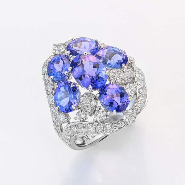 Ring set with tanzanites approx. 4,70 ct. and diamonds approx. 1,45 ct. (F-G/si), in 18 k white gold.