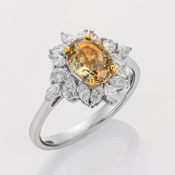 Ring set with a fancy brownish yellow diamond approx. 1,51 ct. (si2) and diamonds approx. 2,27 ct., in 18 k white gold. Certificate included.