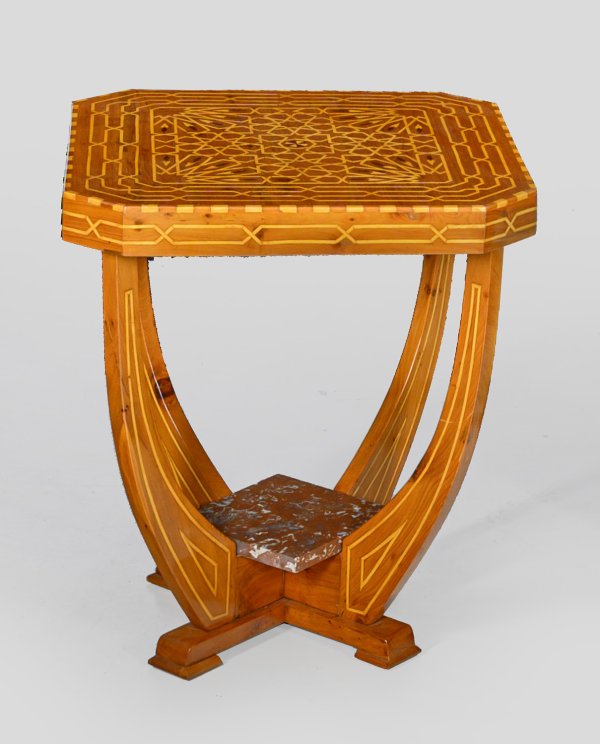 Kirschbaum mit reichen Einlagen aus Ahorn. Über kreuzförmig angelegten Kufen sich konisch verjüngende Streben als Träger für quadratische Deckplatte mit angeschrägten Ecken. Flächendeckend mosaikartig angelegter Intarsiendekor. Unterhalb Abstellfläche aus rotgemasertem Marmor. H. 62 cm. 52 cm x 52 cm.