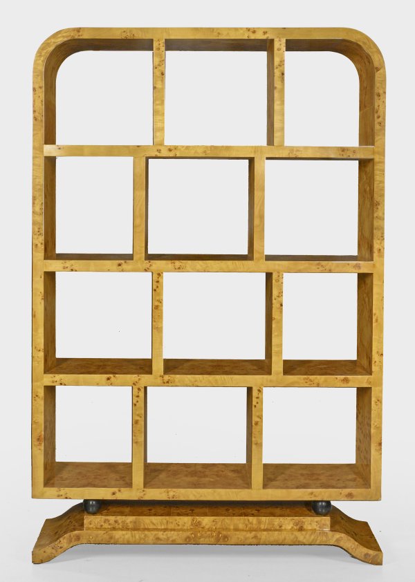 Ahornmaser, akzentuiert. Über geschweift ansteigender Basis und geschwärzten Kugelelementen, hochrechteckiger Korpus mit gerundetem oberen Abschluss. H. 180 cm. 119 cm x 30 cm.