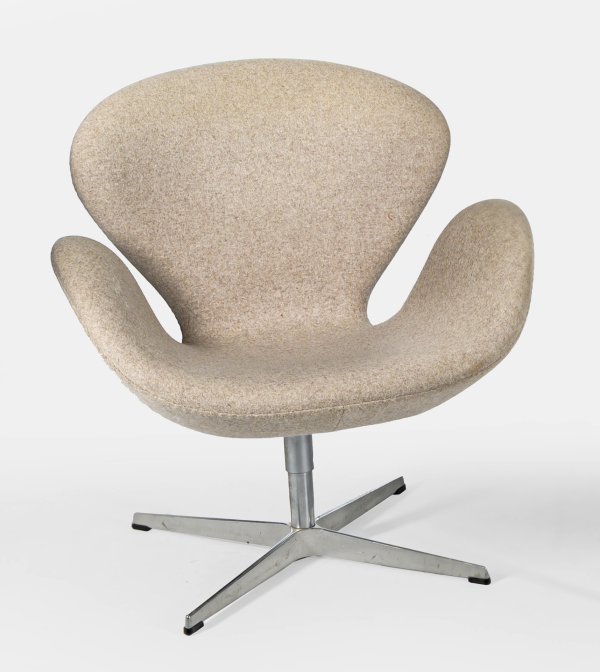 A cream coloured felt and aluminium Swan chair by Arne Jacobsen. Manufacturer's mark.