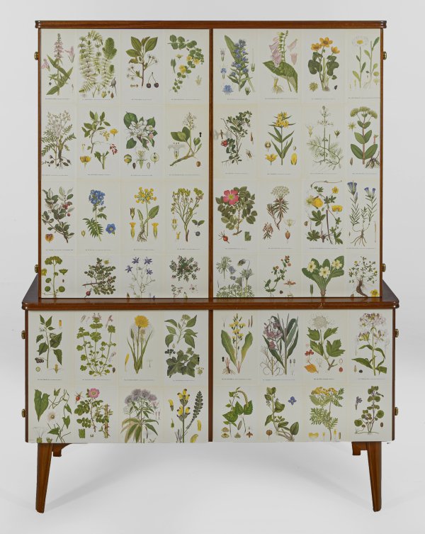 Mahagoni, furniert. Gerader, querrechteckig angelegter, zweitüriger Korpus auf schräggestellten, konischen Beinen. Gering überstehende Deckplatte. Oberhalb korrespondierender, leicht zurückgesetzter, zweitüriger Aufsatz. Dreiseitig flächendeckender Dekor mit Papierillustrationen aus "Bilder ur Nordens Flora" nach Carl A. Lindman. Innen Ablageflächen sowie teilw. Schubladen mit Birkenholzfurnier. Unbez.; H. 148,5 cm. 116 cm x 50 cm.