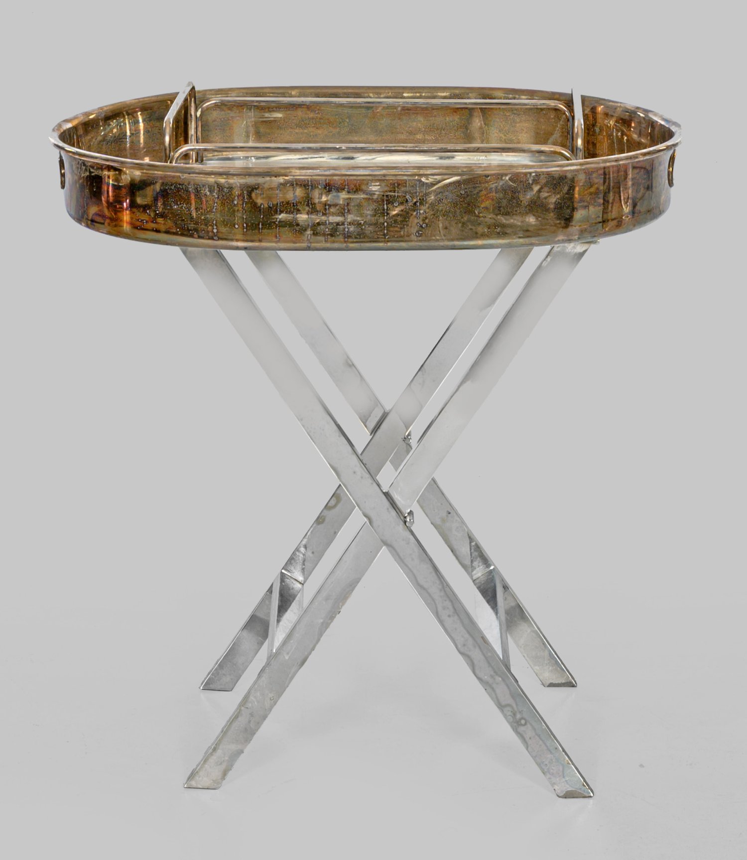 Metall, versilbert. Scherenartiges, faltbares Gestell aus gekanteten Streben als Träger für ovales Tablett mit hoher Rahmung und seitlichen Aussparungen. Herstellerzeichen. H. 65 cm. 63,5 cm x 44,5 cm. Dazu kleines Tablett mit Abstellfläche aus Acryl.