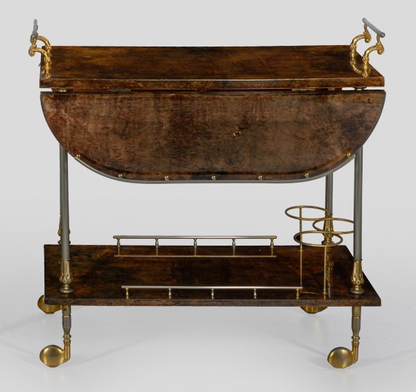 Flächendeckender Fond aus dunkelbraunem, lackiertem Ziegenleder und Metall, vergoldet. Offen gestalteter Korpus aus schlanken Balusterstäben auf Rollen als Träger für seitlich aufstellbare Deckplatte mit Galerierahmung. Unterhalb korrespondierendes Ablagefach mit Einteilung für Flaschen. Unbez.; H. 75 cm. 78,5 cm x 42/78 cm.